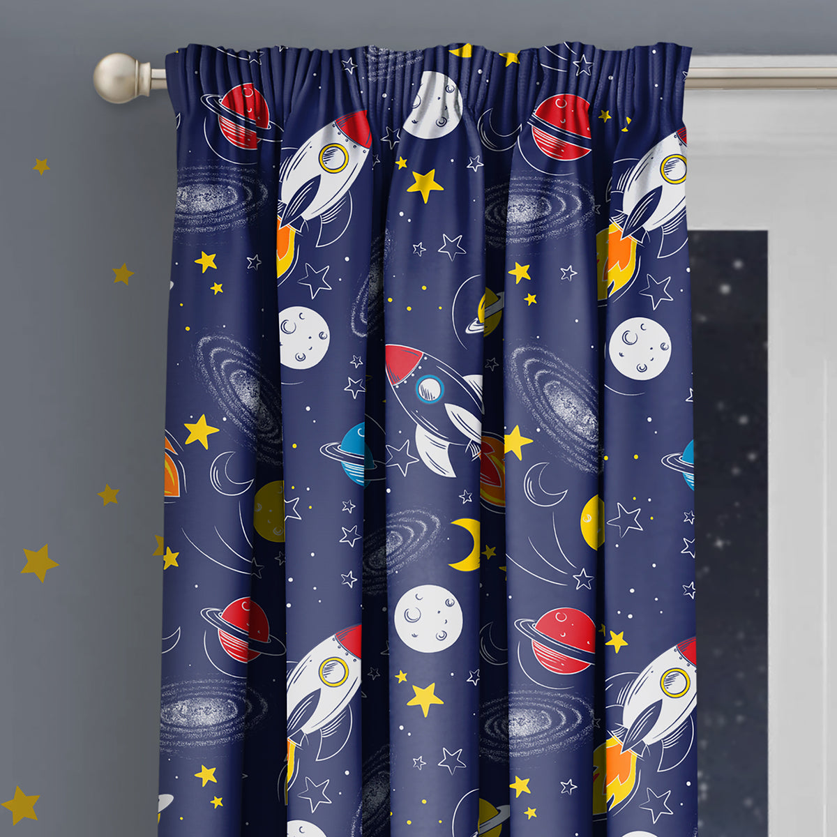 Transform your child's bedroom into a spectacular universe with our Velosso Space Glow In Dark Pencil Pleat Curtains. These navy curtains are adorned with a space print design of spaceships, stars, and planets, perfect for igniting your little one's imagination. And when the lights go out, the real magic begins as the curtains come to life with a mesmerising glow in the dark effect. Share enchanting stories and adventures with your child under the captivating glow of these curtains.