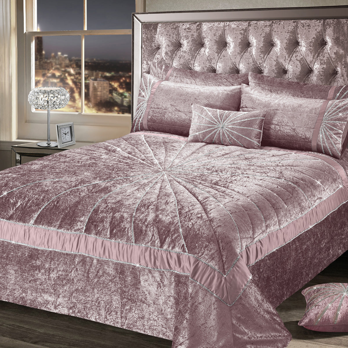 Transform your bedroom into an oasis with our Intimates Starburst Crushed Velvet Diamante Pink Quilted Bedspread. The sophisticated art of layering your bed with a bedspread never goes out of style, and this luxurious option is no exception.
