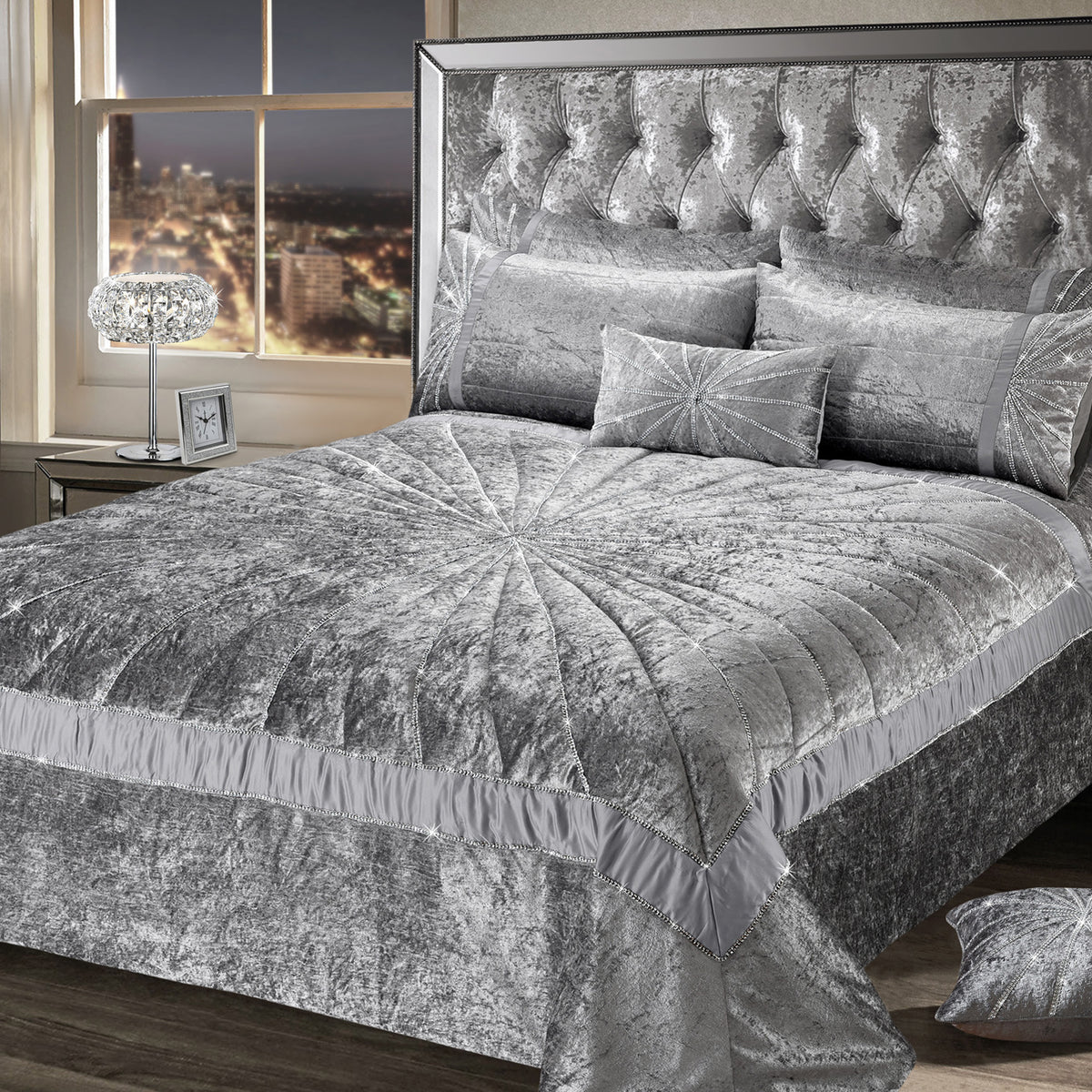 Transform your bedroom into an oasis with our Intimates Starburst Crushed Velvet Diamante Silver Quilted Bedspread. The sophisticated art of layering your bed with a bedspread never goes out of style, and this luxurious option is no exception.