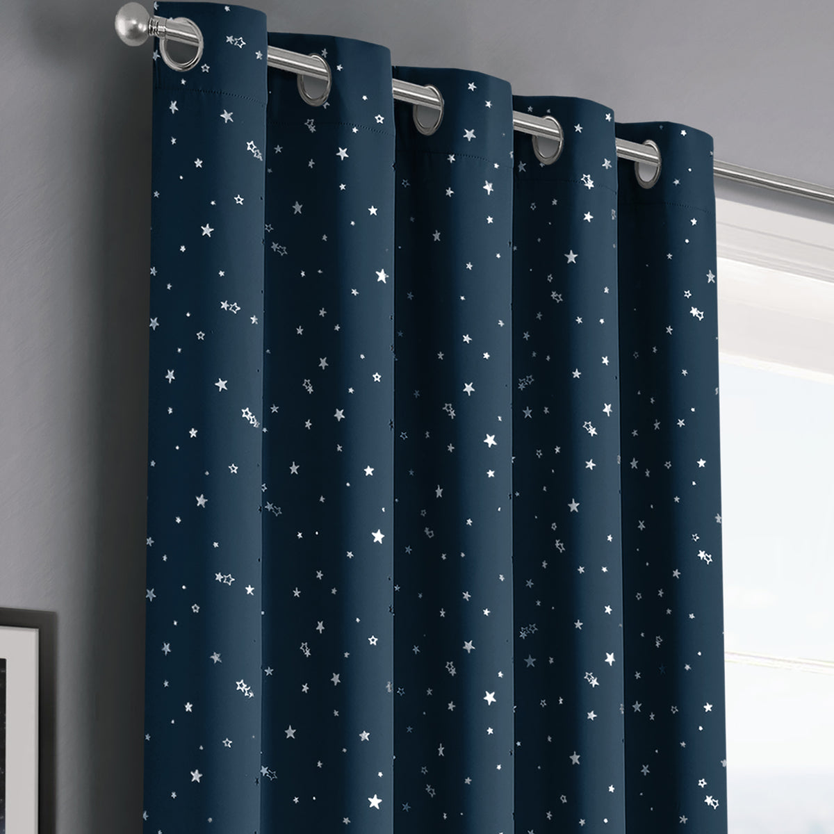 Bring a touch of cosmic charm to your home with our Velosso Stars Navy Ready Made Thermal Blackout Curtains. Featuring a bold navy blue background with small white stars printed on the fabric, these curtains are sure to create a magical atmosphere in your room. The thermal blackout properties of these curtains help to reduce noise levels, protect from UV rays, and block out any unwanted light, ensuring that you can get a good night's sleep. Made from high-quality polyester, these curtains are durable and machine washable. Available in a range of sizes, this pair of curtains is perfect for any room in your home.