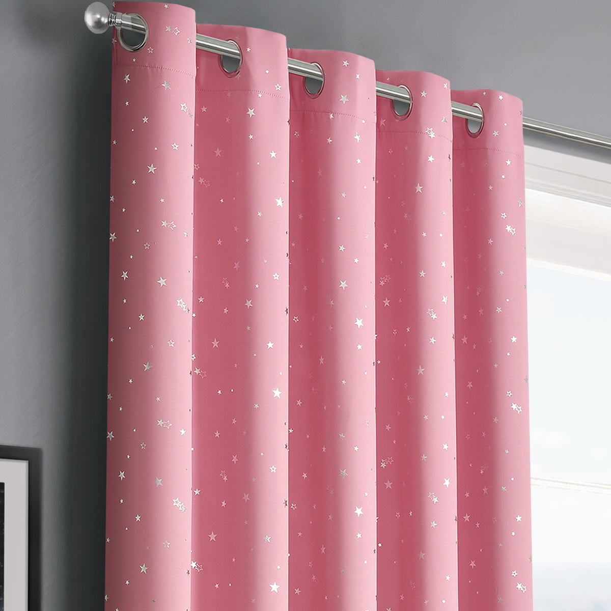 Revamp your living space with our Velosso Stars Pink Thermal Blackout Ready Made Eyelet Curtains. Adorn your windows with these beautiful curtains featuring a stunning pink backdrop with a scatter of stylish geometric foil printed stars all over them. These curtains are crafted with high-quality polyester fabric that ensures durability and longevity. You can easily install these curtains using the chrome eyelet header that guarantees a smooth sliding motion and hassle-free installation. The fabric drapes elegantly to create perfect folds and structure, adding a touch of sophistication to your room. These curtains will not only enhance the aesthetic appeal of your room but will also block out unwanted sunlight and noise, ensuring a comfortable and peaceful environment.