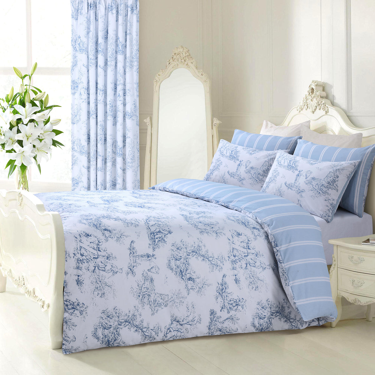 A classic shade of pale blue with an intricate French toiling print design with matching pillowcases, perfect for a classic looking bedroom. This beautiful shade of blue will complement most neutral and pastel colour pallets. Made from a quality polycotton blend, a blend of both polyester and cotton, a super soft, wrinkle-free, non-iron and lightweight fabric that is easy to maintain and will work all year round, Machine washable.