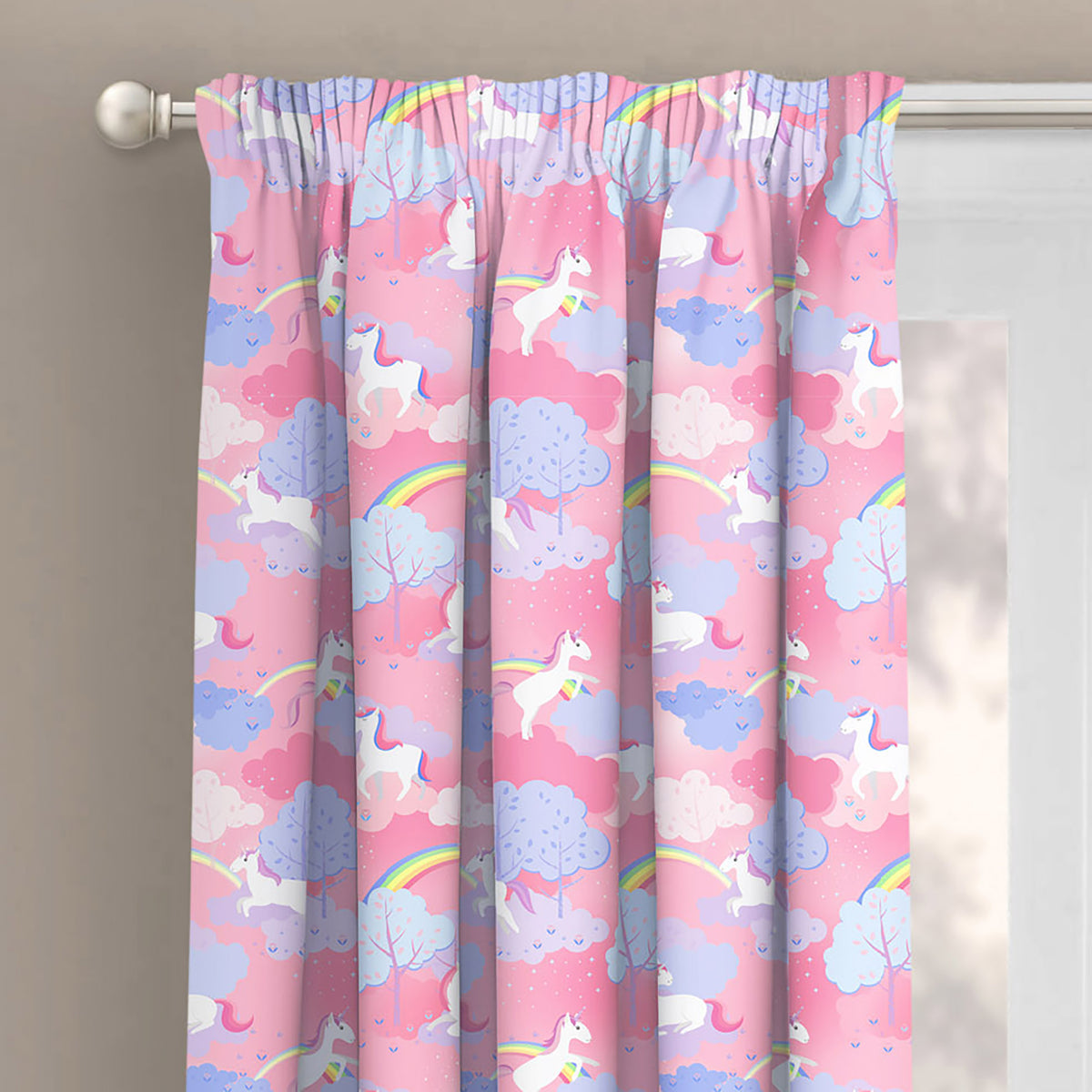 Transform your little one's bedroom into a magical wonderland with our Velosso Unicorn Rainbow Pencil Pleat Curtains. Let your child's imagination run wild with flying unicorns, rainbows, cute flowers and trees scattered all over these gorgeous pink curtains. These curtains are the ultimate dream come true for any unicorn lover! Crafted from a super-soft polycotton material, these curtains feature a three-inch tape header making it easy to hang them on a curtain pole or any curtain track. Your child will love how cosy and comforting these curtains feel, while the stunning unicorn and rainbow design will add a pop of colour and life to their room. Get ready for endless smiles and enchantment with these charming curtains.