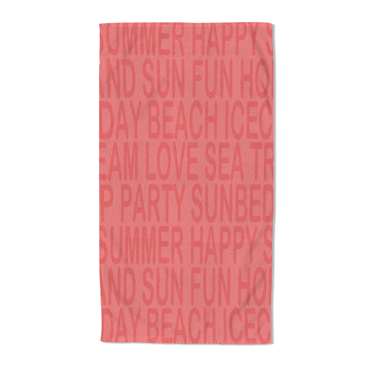 The intricate jacquard weave adds texture and depth to the design, while the beautiful salmon pink colour is sure to catch everyone's eye. The woven words such as "sun", "fun", and "beach" create a lively and vibrant design that is perfect for those who love to have fun in the sun.
