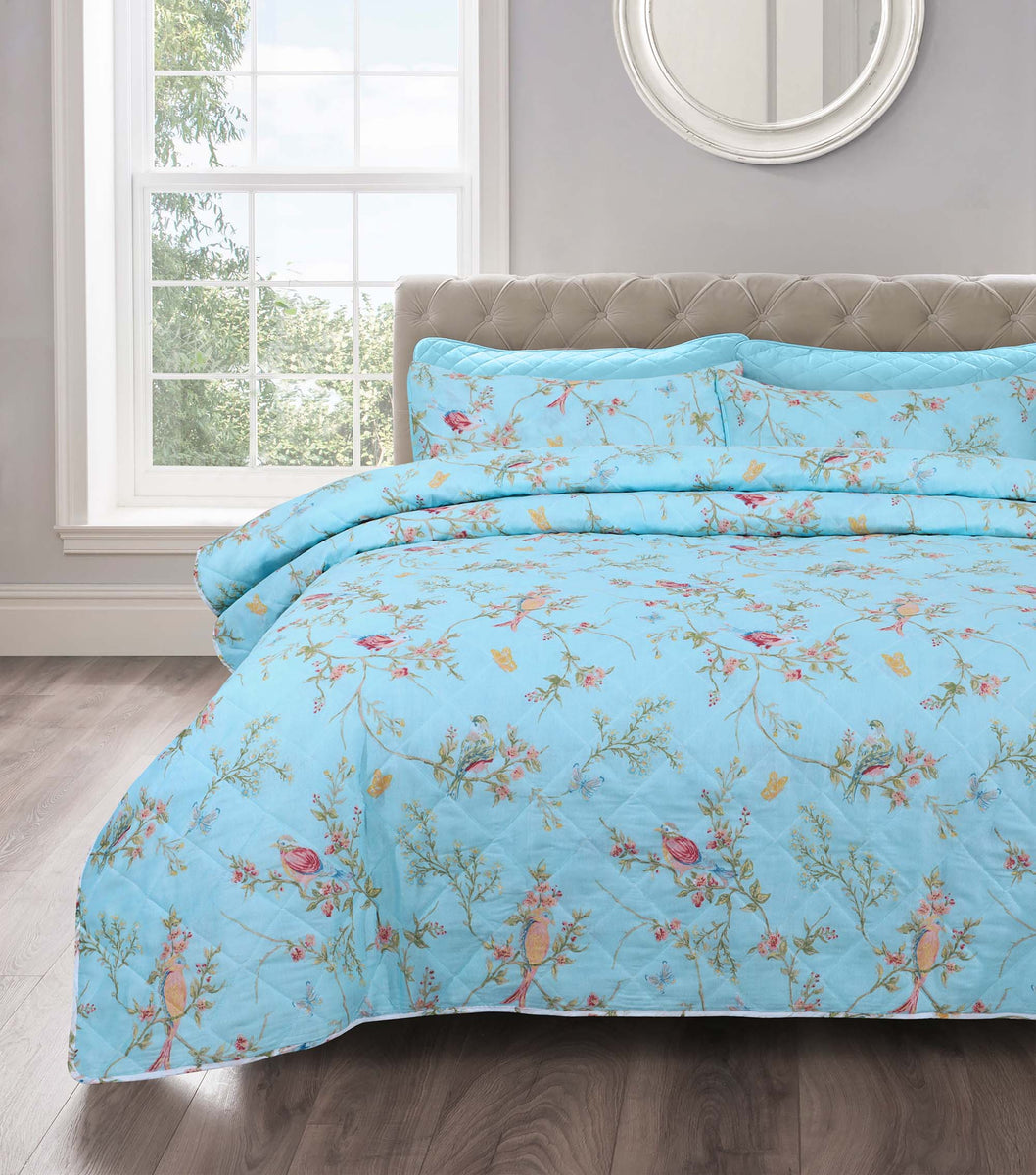 Elevate your bedroom to a realm of luxury with our Velosso Birds Floral Duck Egg Quilted Bedspread Set. Unveil a haven of timeless elegance, courtesy of this exquisite ensemble featuring a sumptuously thick quilted bedspread adorned with a charming pattern of birds perched on delicate branches on a duck egg background. The coordinating pillow shams complement this design, creating a harmonious aesthetic that captures the beauty of nature.