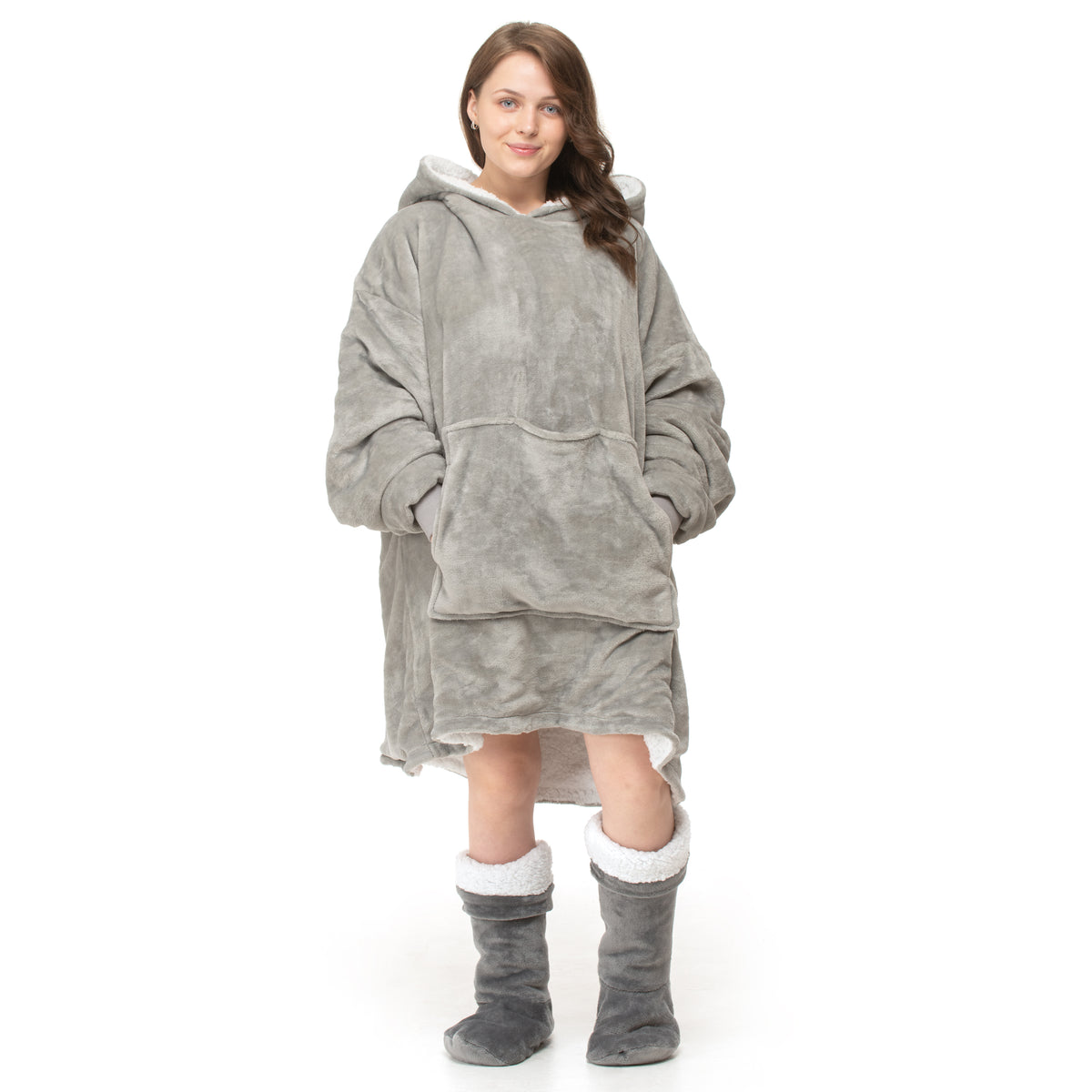 Stay warm in winter with our Velosso Grey Oversized Sweatshirt. This super cosy grey hoodie is made from a luxurious Sherpa inner lining, with flannel on the outside. It comes with an oversized hood that covers your neck, head and ears keeping you warm and toastie, and features a large two-way pocket that will keep your hands and arms snug. Our grey oversized hoodie is machine washable and easy to care for.