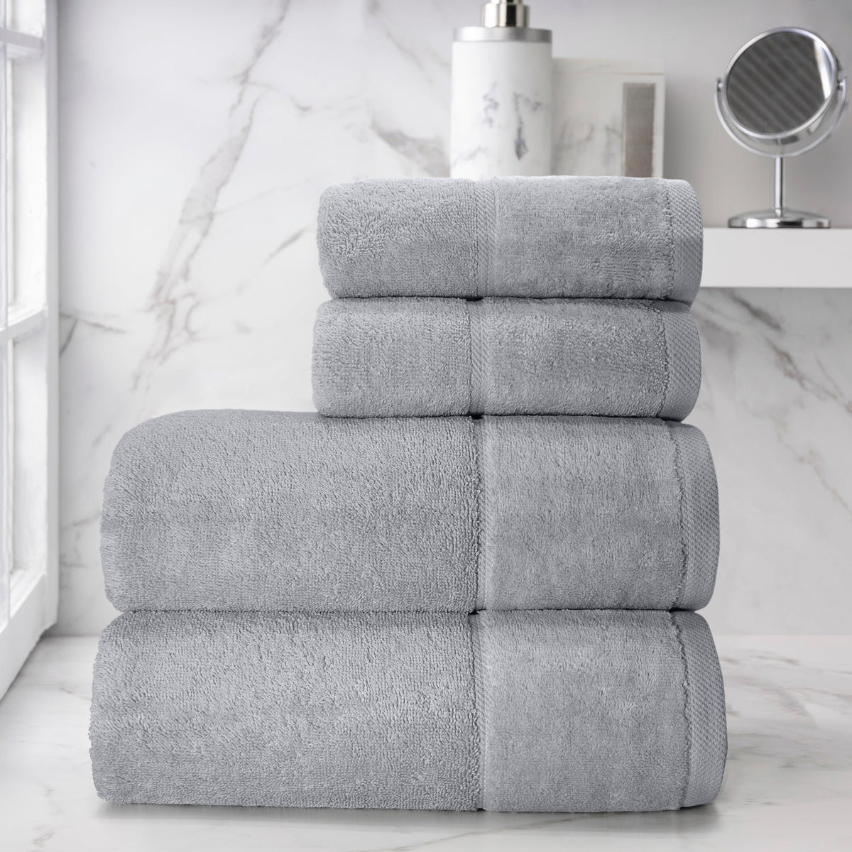 The plush velour finish of these silver towels is incredibly soft and luxurious, making them the perfect choice for anyone who loves to wrap themselves in comfort after a shower or bath. They're machine washable and can be tumble dried on a low setting, making them easy to clean and maintain. These silver towels also feature a simple and classic design, with a subtle border at the bottom of each towel.