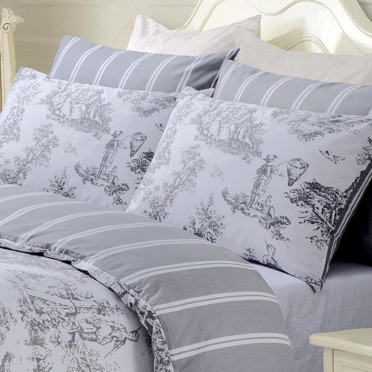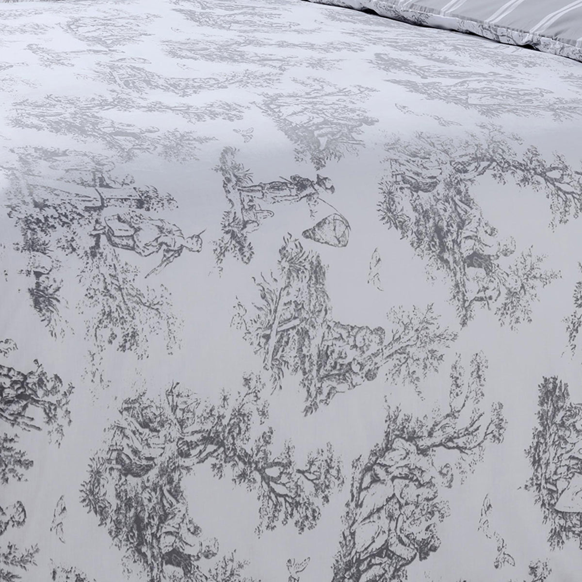 Shop our Velosso Toile Grey Reversible Duvet Cover & Pillowcase Set. This duvet cover features a timeless toile design in a serene shade of grey, gracefully sprawled across a pristine white background. Elevate the ambiance of your bedroom with the sophisticated charm of this toile inspired pattern, adding a touch of refinement to your décor.