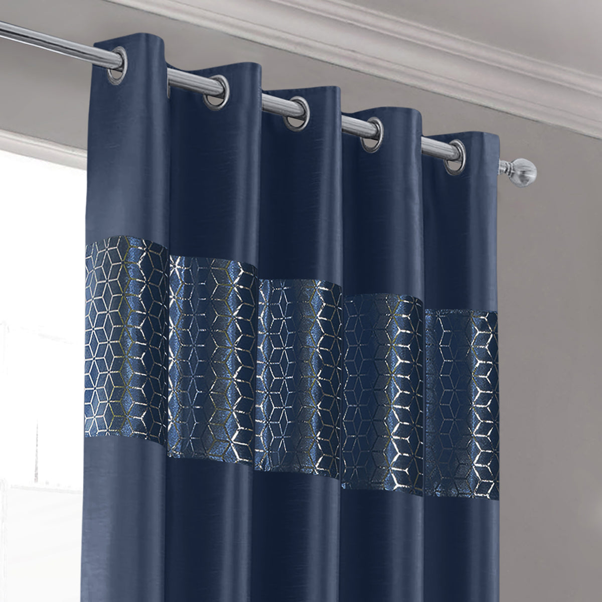 Transform your home décor with our Intimates Vera Navy Faux Silk Crushed Velvet Ready Made Eyelet Curtains, the perfect blend of luxury and sophistication. If you love to indulge in glamour and elegance, these curtains will be your new favourite. The vibrant shade of navy blue, along with a stunning geometric silver foil print design on a heavenly crushed velvet border, will add a touch of glamour to your room décor. The curtains are made from high-quality faux silk fabric with a natural shimmer, fully lined for a graceful drape.