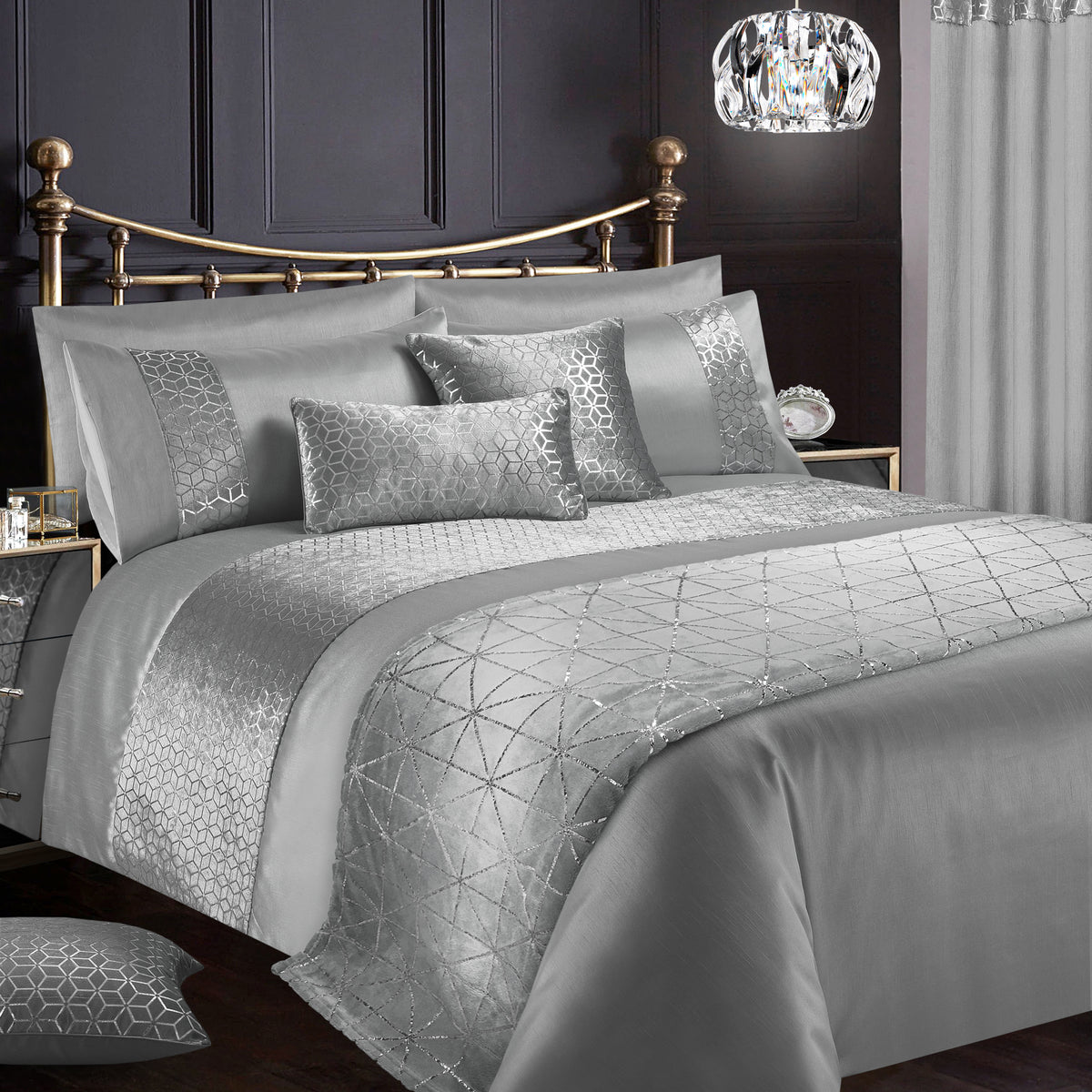 Make a bold statement with this stunning bedding set in a luxurious shade of silver. The geometric silver foil print design on the quilted crushed velvet cuff is sure to turn heads and have your guests asking for style tips. The matching pillowcases complete the look, making our Intimates Vera Geometric Crushed Velvet Silver Duvet Cover and Pillowcase Set truly striking. The beautiful faux silk fabric boasts a natural sheen and a textured feel, while the polyester underside provides comfort for a restful night's sleep. This silver geometric duvet cover set is not only gorgeous, but also practical, with its crease-resistant and machine washable properties.