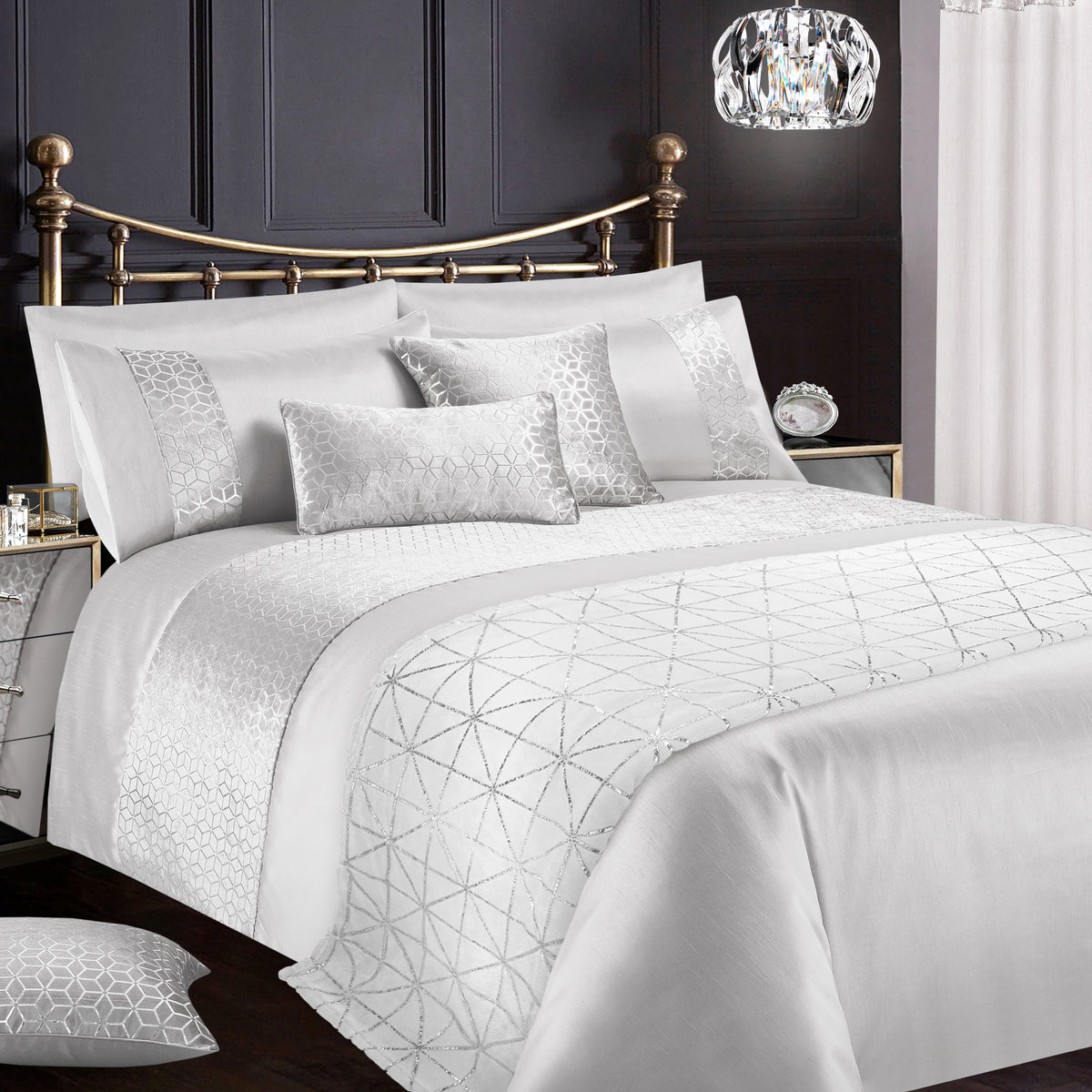 Make a bold statement with this stunning bedding set in a crisp shade of white. The geometric silver foil print design on the quilted white crushed velvet cuff is sure to turn heads and have your guests asking for style tips. The matching pillowcases complete the look, making our Intimates Vera Geometric Crushed Velvet White Duvet Cover and Pillowcase Set truly striking. The beautiful faux silk fabric boasts a natural sheen and a textured feel, while the polyester underside provides comfort for a restful night's sleep. This classic white geometric duvet cover set is not only gorgeous, but also practical, with its crease-resistant and machine washable properties.