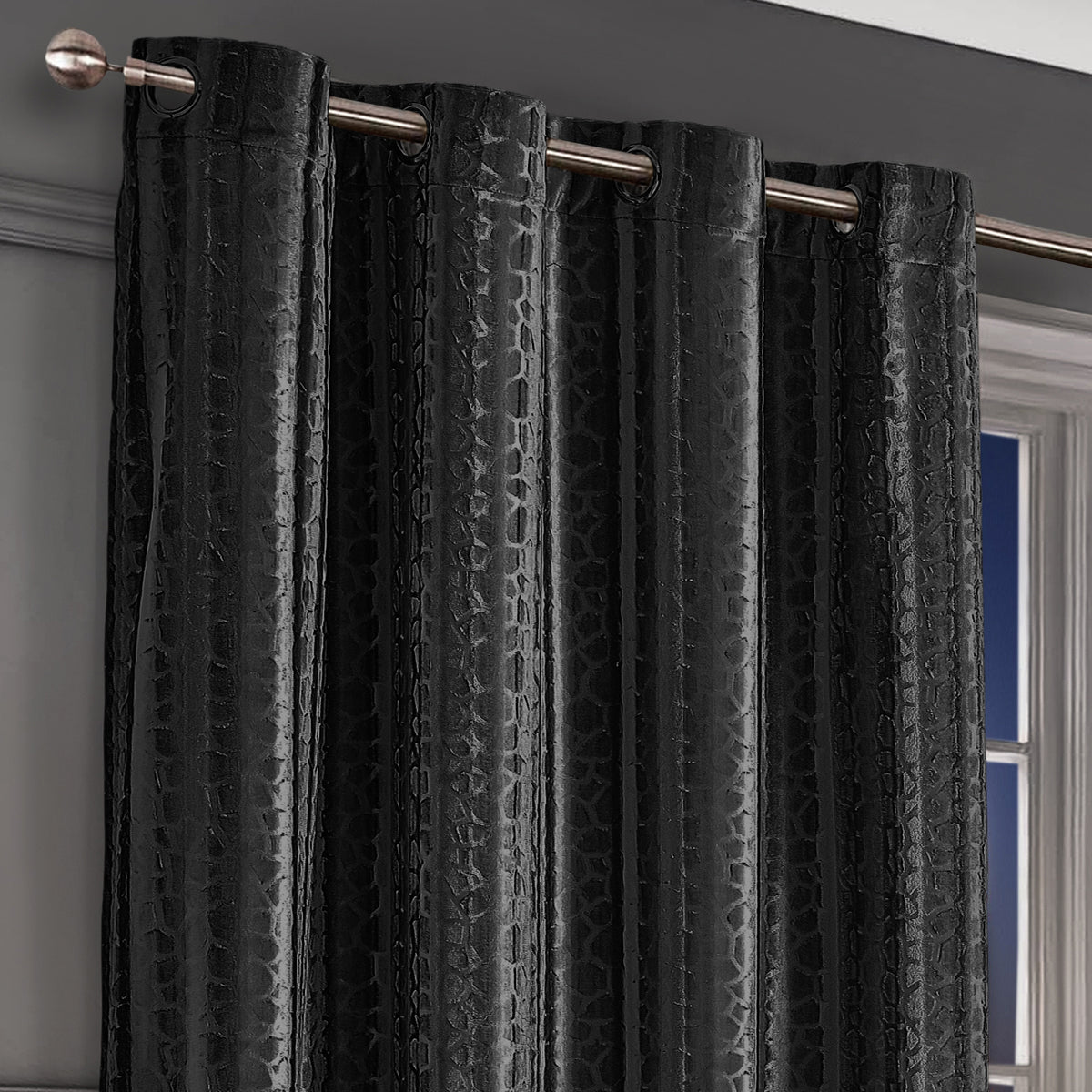 Revamp your living space effortlessly with our Intimates Verity Black Crushed Velvet Ready Made Embossed Curtains. These curtains exude modernity and sophistication, making them a perfect fit for any contemporary home. The rich black shade will add an elegant touch to your décor, especially when paired with neutral hues or white walls. The crushed velvet fabric boasts an embossed snakeskin print that creates a textured and edgy feel.