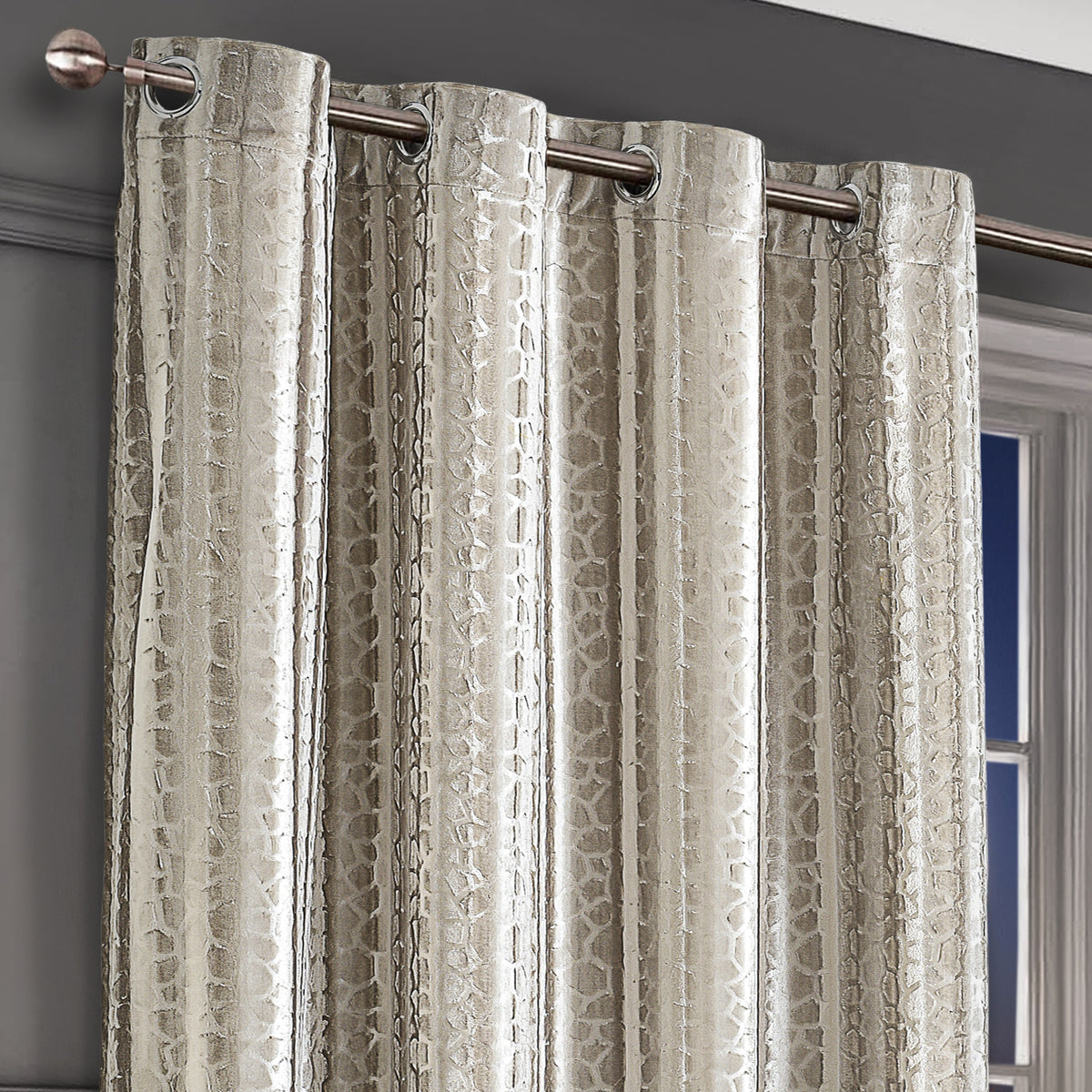 Revamp your living space effortlessly with our Intimates Verity Natural Crushed Velvet Ready Made Eyelet Curtains. These curtains exude modernity and sophistication, making them a perfect fit for any contemporary home. The natural beige shade will add an elegant touch to your décor, especially when paired with neutral hues or white walls. The crushed velvet fabric boasts an embossed snakeskin print that creates a textured and edgy feel.