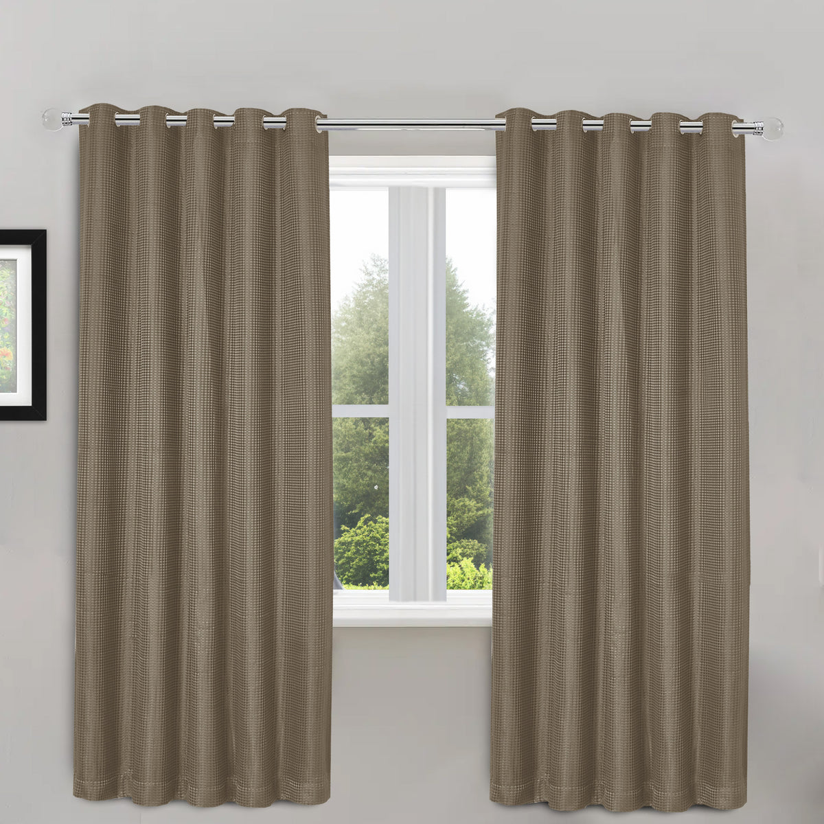 Elevate your home décor with our luxurious Velosso Waffle Weave Natural Total Blackout Jacquard Eyelet Header Curtains, designed to seamlessly blend elegance with practicality. These curtains feature a sophisticated waffle jacquard pattern, adding texture and depth to any room with meticulous attention to detail.