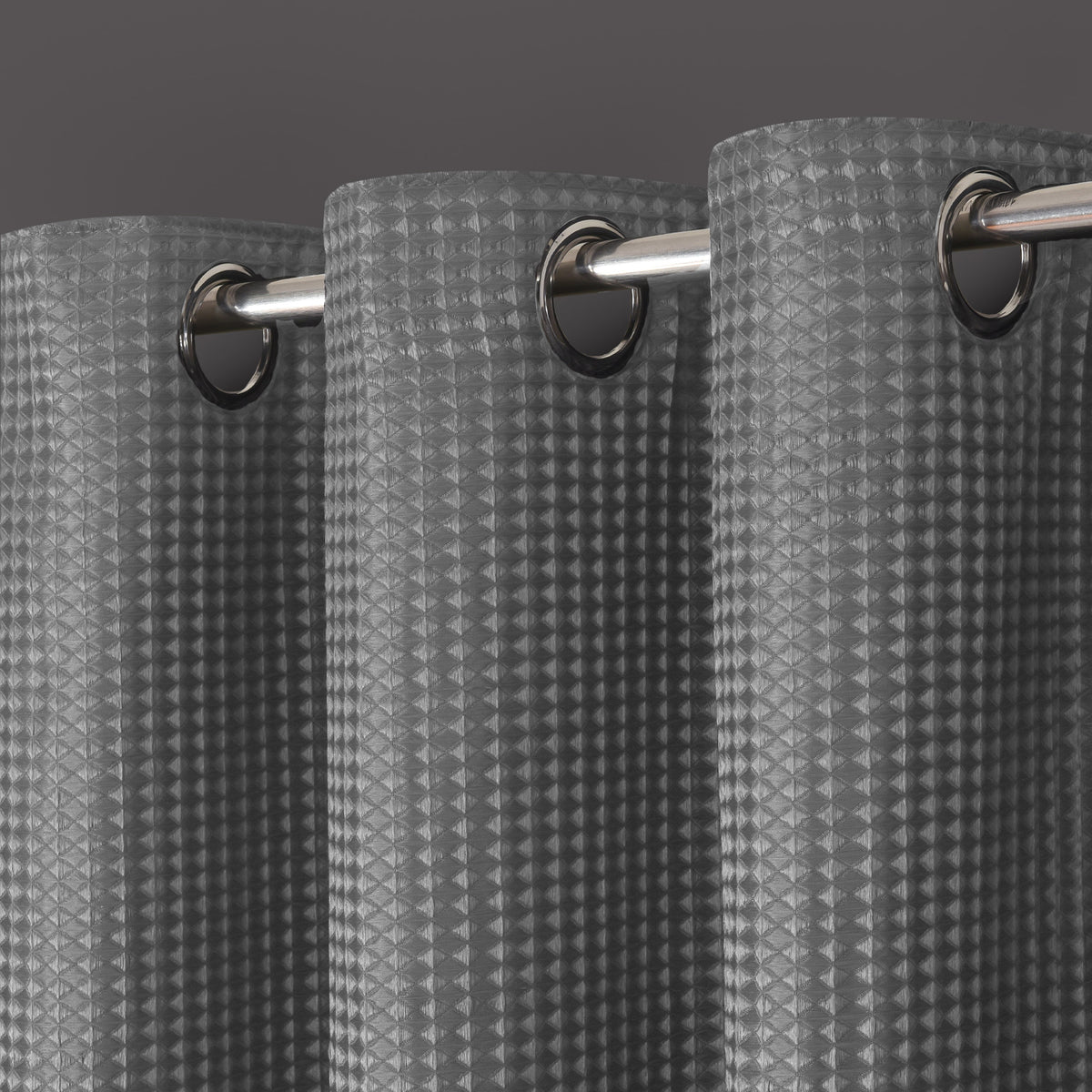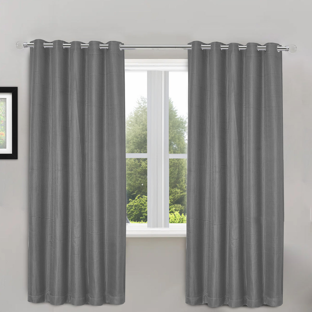 Elevate your home décor with our luxurious Velosso Waffle Weave Silver Total Blackout Jacquard Eyelet Header Curtains, designed to seamlessly blend elegance with practicality. These curtains feature a sophisticated waffle jacquard pattern, adding texture and depth to any room with meticulous attention to detail.