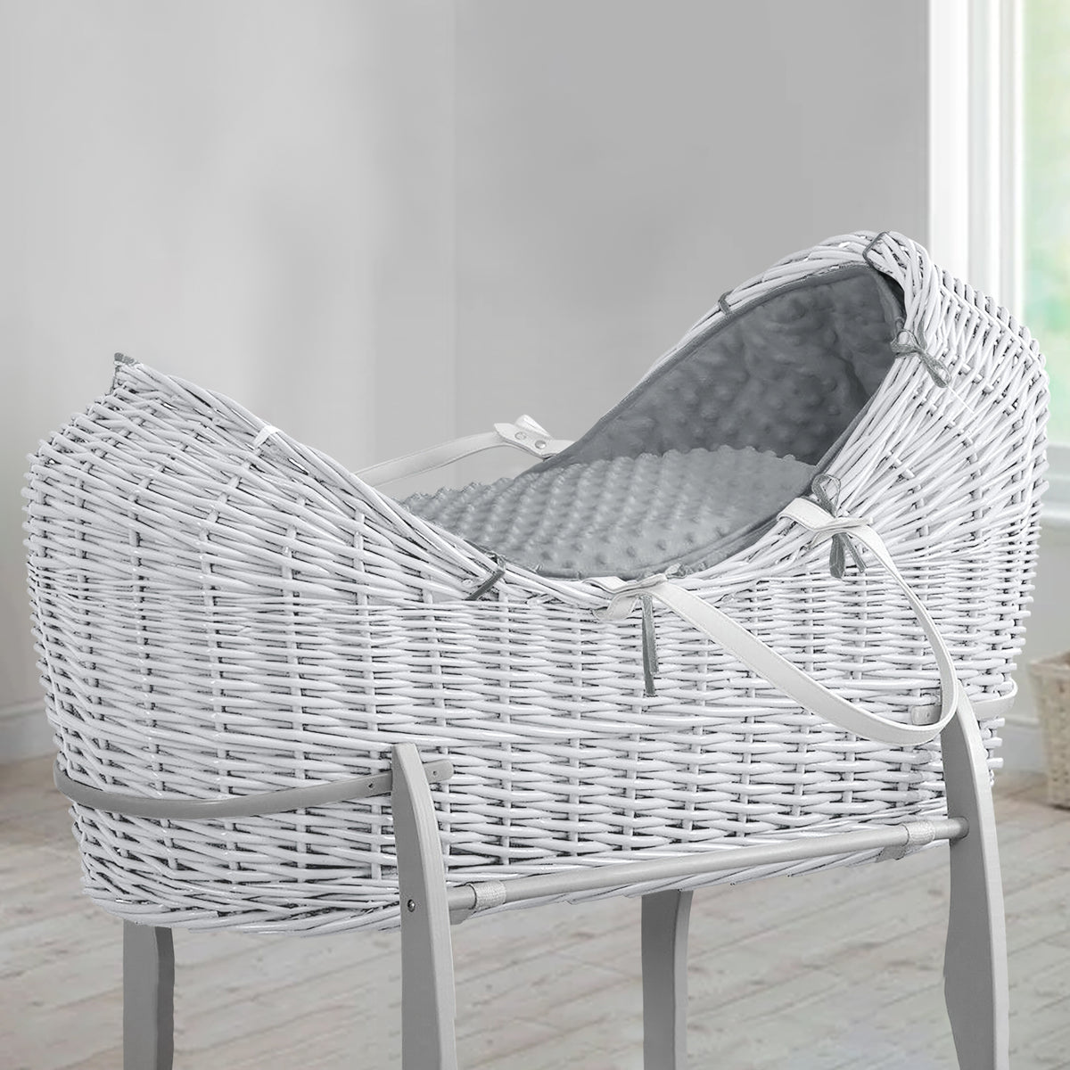 This adorable white Pod Moses Basket with grey popcorn dressing is designed to keep your little one calm and peaceful during those precious moments of sleep. Its beautiful pod design with cute satin ties offer both comfort and style. Dressed with a super-soft popcorn dresser that is luxurious and exquisite looking. The perfect addition to your baby's nursery.