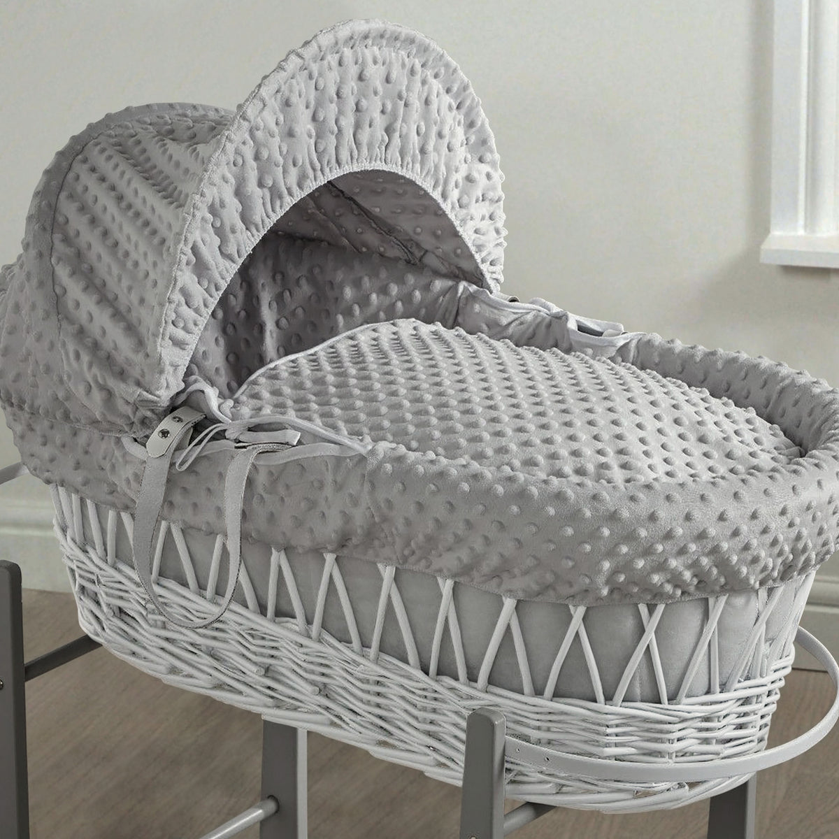 This adorable white wicker basket with grey popcorn dressing Pod Moses Basket is designed to keep your little one calm and peaceful during those precious moments of sleep. A carefully crafted pod design with cute panache satin ties offers comfort and style in one. Dressed with a soft quilted liner, mattress, gorgeous quilted coverlet, this would make a perfect addition to your baby's nursery. Our wicker pod has faux leather handles which allow for easy transportation between rooms, ensuring your baby remains undisturbed in their slumber.